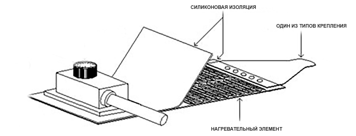Нагревательный элемент в силиконовых нагревателях находится внутри слоев силикона, которые выполняют роль изолятора. Равномерность нагрева гибкого нагревателя из силикона создается при подборе типа стекловолоконного материала, которое обволакивает греющий проводник. Возможно изготовление силиконового нагревателя с встроенным термостатом, который будет контролировать температуру нагрева элемента. Также доступны несколько типов вывода электропитания и несколько вариантов креплений. Форма и размеры нагревателей могут быть произвольными по вашему заказу.