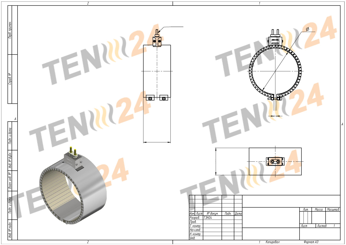 На металлическом корпусе могут размещаться всевозможные вырезы и крепежные детали. Так как ТЭН 24 занимается изготовлением нагревателей с индивидуальными параметрами, для того, чтобы заказать уникальный кольцевой электронагреватель можно нам на электронную почту отправить чертеж, либо позвоните нам по телефону и опишите все параметры и размеры нагреваемой поверхности, мы поможем произвести расчет наиболее подходящего нагревательного элемента.
