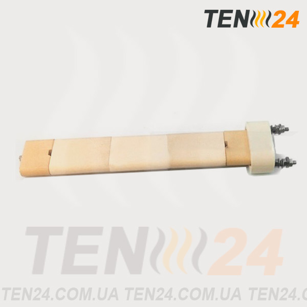 ТЭН плоский для печей состоит, так же, как и цилиндрический сухой ТЭН, из нескольких блоков-изоляторов из технической керамики. Только в данном случае используются блоки плоской формы с сечением со скругленными углами. Внутри изоляторов есть специальные сквозные отверстия для расположения греющих спиралей, таким образом нагревательная жила проходит через несколько керамических элементов.