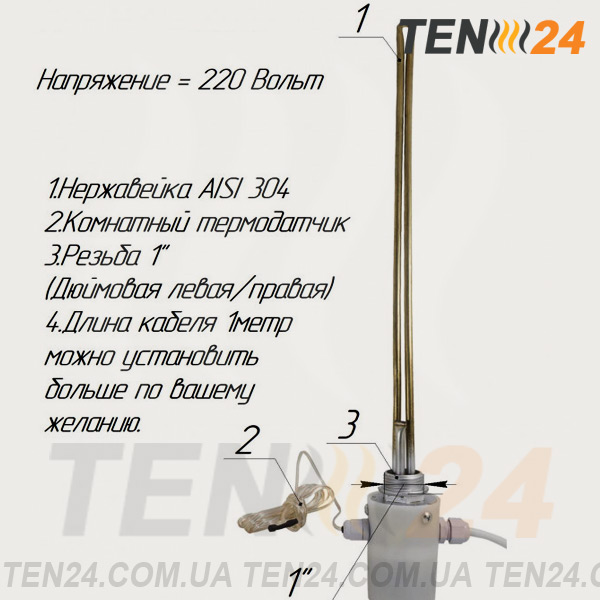 Греющий ТЭН изготовлен в компании ТЭН 24 с мощностью 500 Вт, напряжением 220 В, размерами длина ТЭНа 325 мм. .