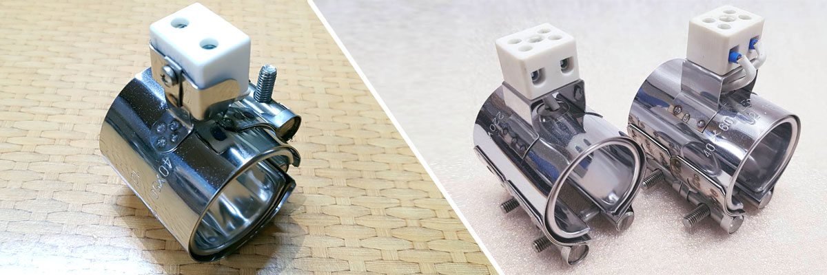 Соплові хомутові нагрівачі виділяються невеликими параметрами і високою подачею потужності. Резисторний нагрівач захищає сталева нержавіюча оболонка. Максимальна подача температури дорівнює 350 °С.