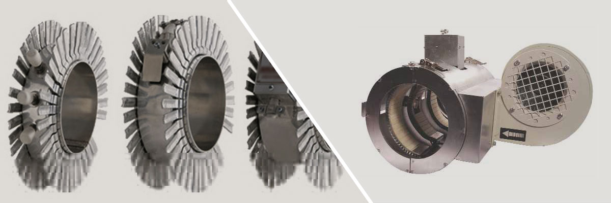 Кільцевій нагрівач з примусовим охолодженням може бути мати керамічну або міканітову ізоляцію. Найчастіше ці пристрої монтують на лінії екструзівного виробництва. В якості охолоджувача виступає спеціальний вентилятор, що рівномірно розподіляє тепло і виробляє охолодження самого нагрівача. Максимальне температурне вироблення кільцевого нагрівача з примусовим охолодженням 450 град. Цельсія. Монтаж даного пристрою проводиться дуже швидко, і легко тому що він складається з двох півсфер, з'єднаних між собою. Кріплення проводиться за рахунок спеціальних стяжних болтів.