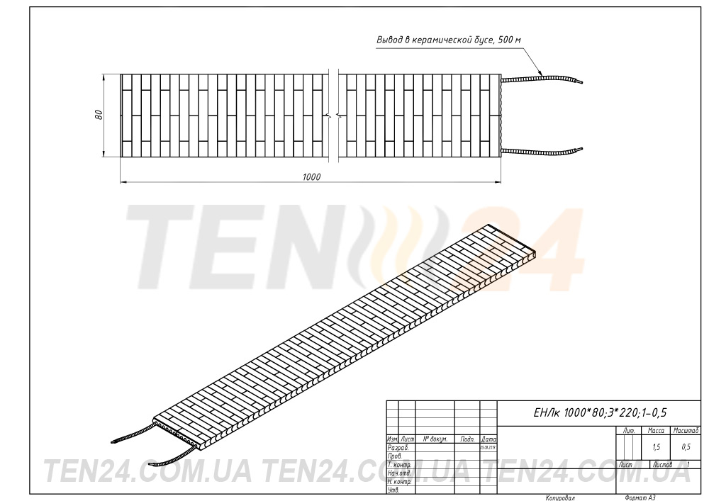 Гріючий елемент виготовлений в компанії ТЕН 24 з потужністю 3000 Вт, напругою 220 В, розмірами 1000 х 80 мм, варіантом виведення живлення "Термостійкі дроти в ізоляції з керамічних бус".