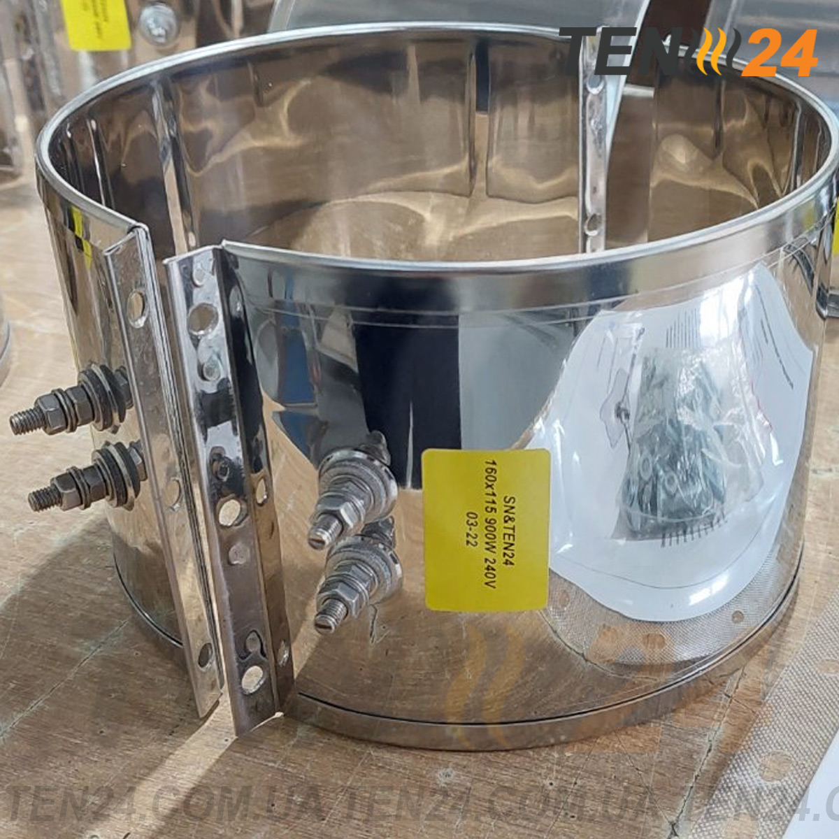 Нагрівач виготовлений в компанії ТЕН 24 з потужністю 900 Вт, напругою 240 В, розмірами діаметр 160 мм, висота 115 мм, варіантом виведення живлення "Варіант 12. Болти".