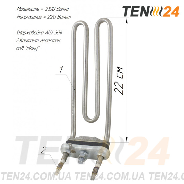 Нагрівач виготовлений в компанії ТЕН 24 з потужністю 2100 Вт, напругою 220 В, варіантом виведення живлення "пелюстки, колодка стандартна під термодатчик".