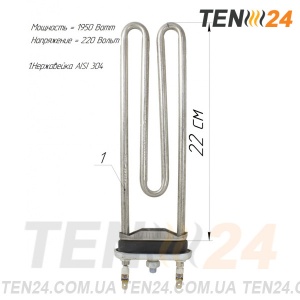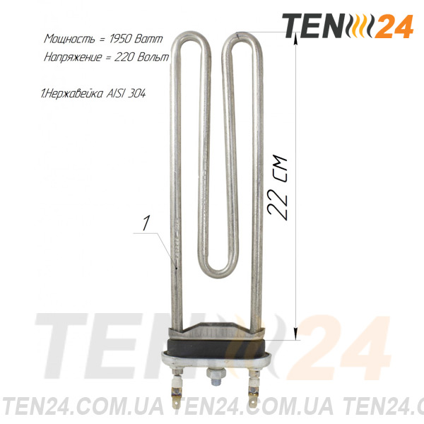 Нагрівач виготовлений в компанії ТЕН 24 з потужністю 1950 Вт, напругою 220 В, варіантом виведення живлення "пелюстки, колодка стандартна з отвором і без отвору під термодатчик".