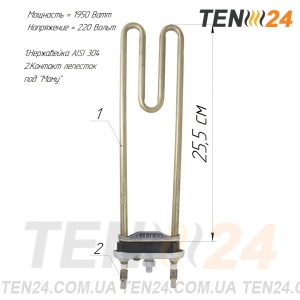Нагрівальний ТЕН виготовлений в компанії ТЕН 24 з потужністю 1950 Вт, напругою 220 В, варіантом виведення живлення "пелюстки, колодка стандартна без отвору під термодатчик".