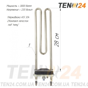 Трубчастий електронагрівач виготовлений в компанії ТЕН 24 з потужністю 3000 Вт, напругою 220 В, варіантом виведення живлення "пелюстки, колодка стандартна без отвору під термодатчик".