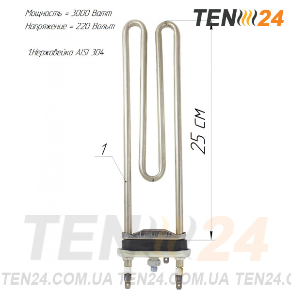 Нагрівач виготовлений в компанії ТЕН 24 з потужністю 3000 Вт, напругою 220 В, варіантом виведення живлення "пелюстки, колодка стандартна з отвором і без отвору під термодатчик".