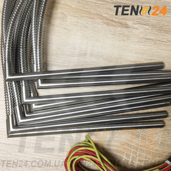 Нагрівальний пристрій виготовлений в компанії ТЕН 24 з потужністю 300 Вт, напругою 220 В, варіантом виведення живлення "кутове виведення з гофрованою обплыткою".