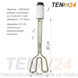 Нагрівальний елемент (ТЕН) виготовлений в компанії ТЕН 24 з потужністю 2000 Вт, напругою 220 В,